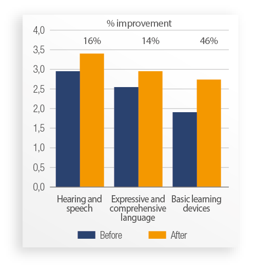 Participants finished with better discrimination of sound sources, as well as greater frecuency, speed, accent and intonation. They demonstrate improved organization of ideas, listening capacity and comprehension. More motivation to start and complete activities within the expected timeframe is also higher.